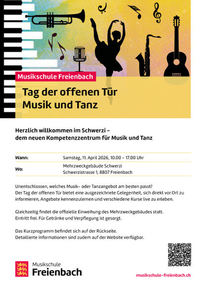 Am Samstag, 11. April 2026, von 10.00 bis 17.00 Uhr findet die Eröffnung des Mehrzweckgebäudes Schwerzi und der Tage der offenen Tür Musik und Tanz statt.